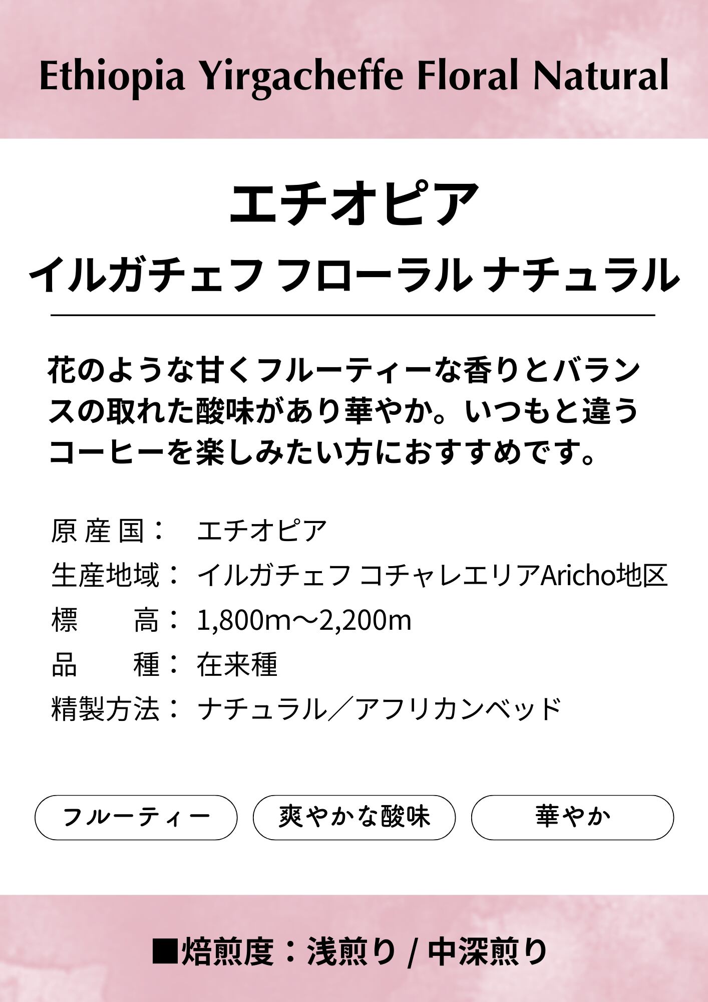 花のような甘くフルーティーな香り、ナチュラル精方由来のバランスの取れた酸味があり、華やかなコーヒーです。