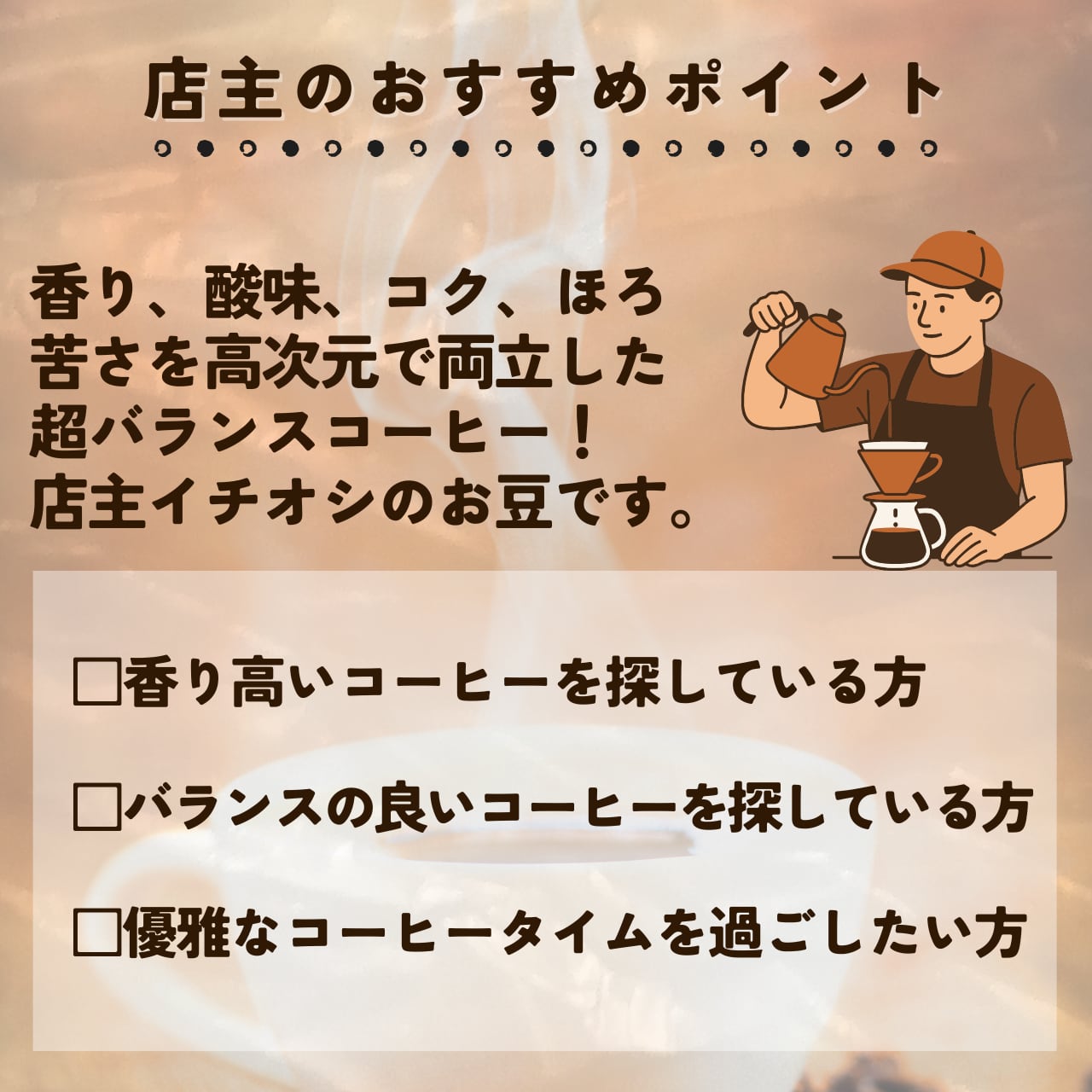 香り、酸味、コク、ほろ苦さを高次元で両立しているとても香り高いコーヒー。
